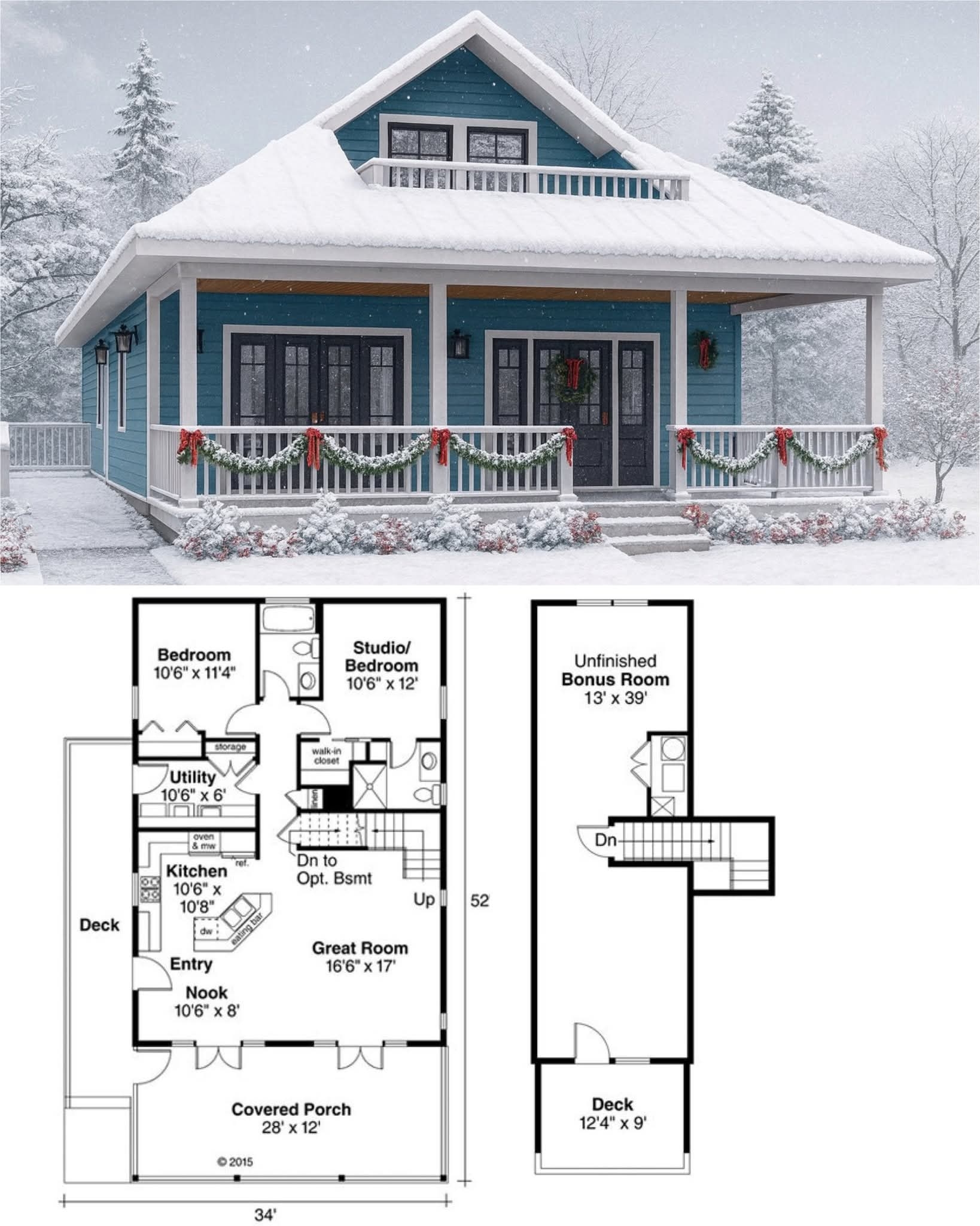 A cozy two-story cottage-style house in a snowy winter setting, decorated for Christmas. The exterior features teal-blue horizontal siding with white trim, a steep gabled roof heavily covered in snow, and a full wraparound covered porch. The porch has white railings adorned with green garlands and red bows, festive wreaths on the doors, and black lantern wall lights. Snow gently falls, with snow-covered shrubs, pine trees, and a soft gray winter sky creating a calm holiday atmosphere. Warm light glows softly from the windows, giving the home a welcoming, storybook feel. Architectural floor plans beneath the exterior view: • Main floor with a large covered front porch (28’ x 12’), great room (16’6” x 17’), kitchen (10’6” x 10’8”), breakfast nook (10’6” x 8’), utility room (10’6” x 6’), one bedroom (10’6” x 11’4”), a studio/second bedroom (10’6” x 12’), bathroom, walk-in closet, and stair access to basement and upper level. • Upper level featuring an unfinished bonus room (13’ x 39’) with stair access and a rear deck (12’4” x 9’). #homesweethome #HomeImprovement #architecture #apartmentforrent #fblifestyle https://www.facebook.com/share/p/1EuTGgPR6V/